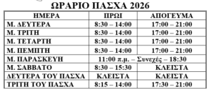 ΕΜΠΟΡΙΚΟΣ ΣΥΛΛΟΓΟΣ ΑΓΡΙΝΙΟΥ ΩΡΑΡΙΟ ΠΑΣΧΑ 2026 ΤΟΠΙΚΑ ΝΕΑ ΕΜΠΟΡΙΚΟΣ ΣΥΛΛΟΓΟΣ ΑΓΡΙΝΙΟΥ ΩΡΑΡΙΟ ΠΑΣΧΑ 2026 30 Μαρτίου 2026 Το Διοικητικό Συμβούλιο του Εμπορικού Συλλόγου Αγρινίου ΄΄Ο ΕΡΜΗΣ 1911΄΄ ενημερώνει τους συναδέλφους και τους φίλους καταναλωτές...Read More